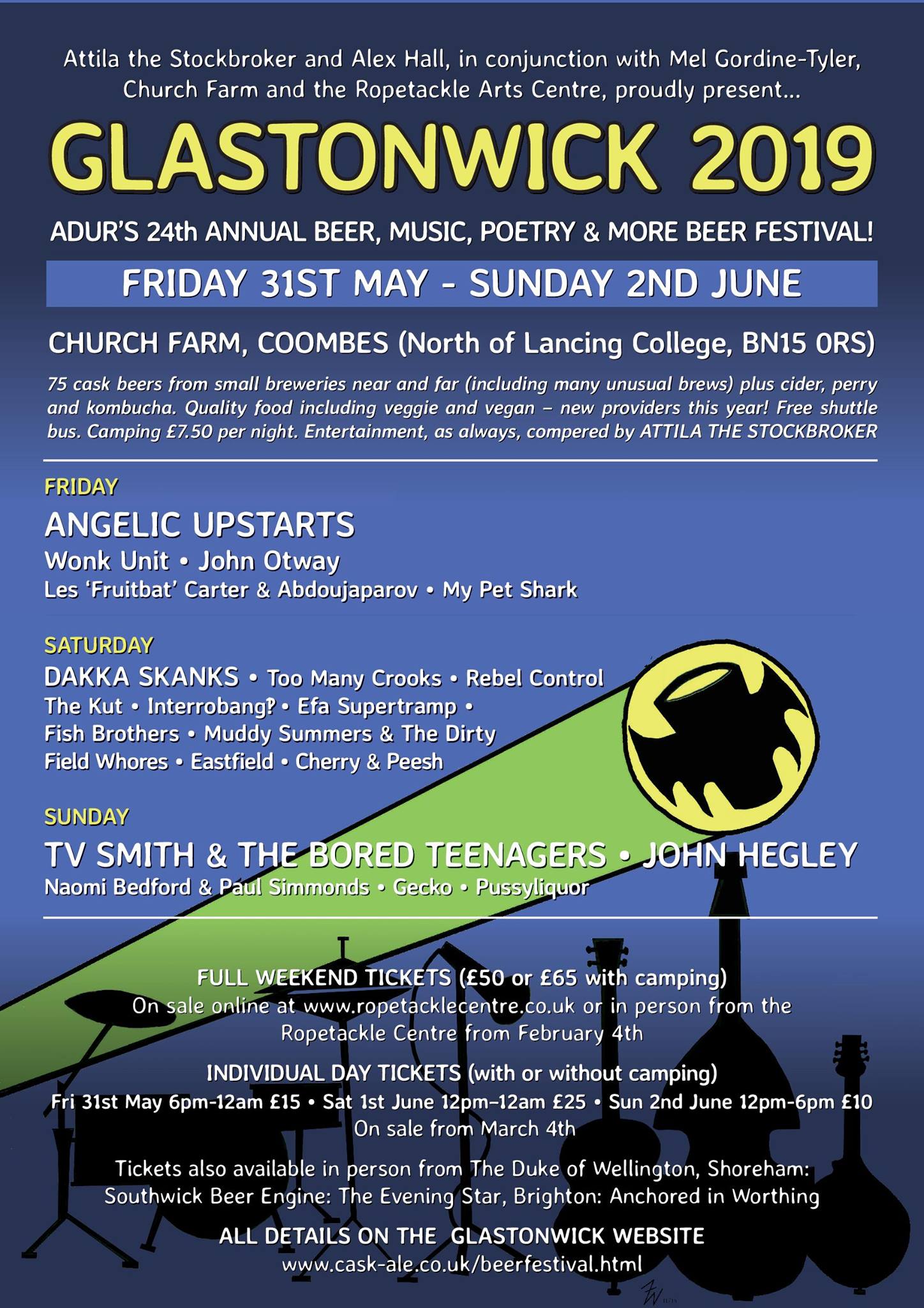 Glastonwick boasts strongest ever line up & more beer than ever. 12th April 2019 Final Hours Listings Attila the Stockbrokers annual Shoreham knees up has its strongest ever line up and also boast 75 different types of cask beer this year. It usually sells out so get your ticket soon if you’re going. STALK US ONLINE HERE: